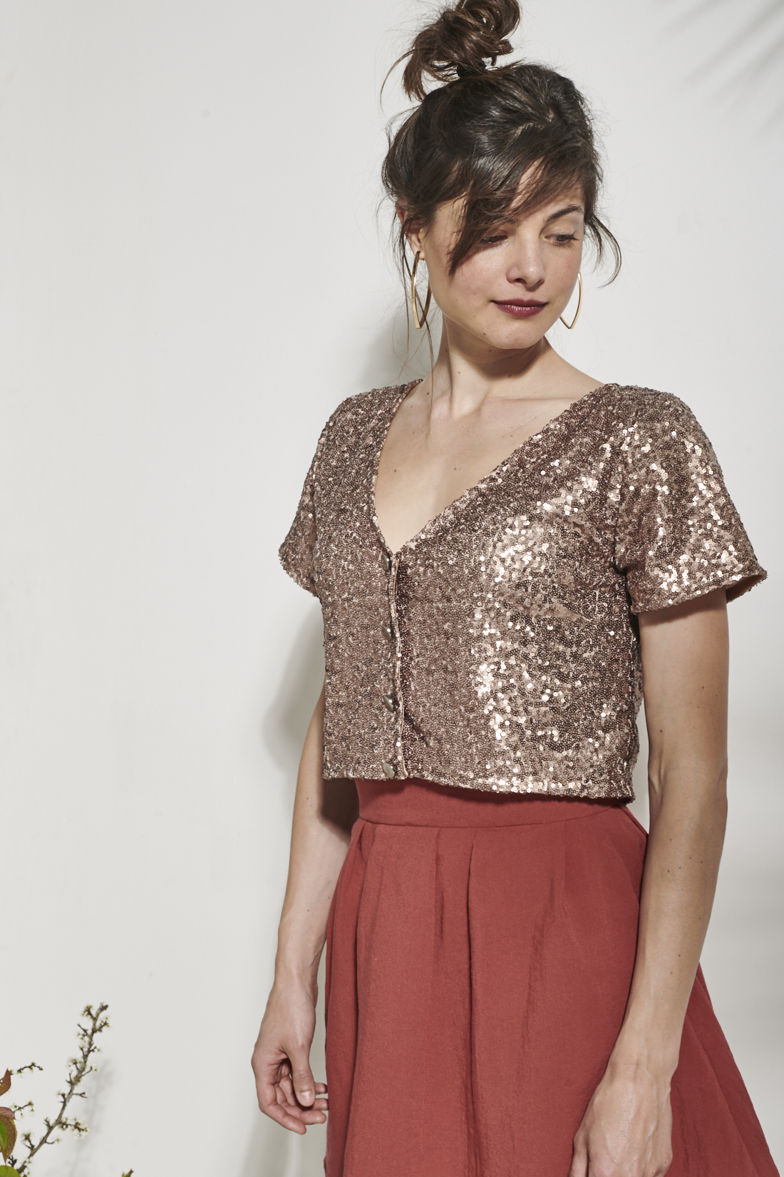 Le haut se porte dans les deux sens : le décolleté et les boutons peuvent se mettre devant ou au dos